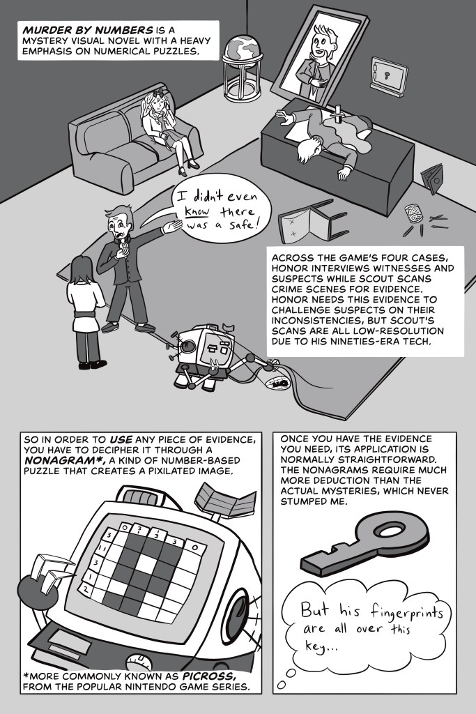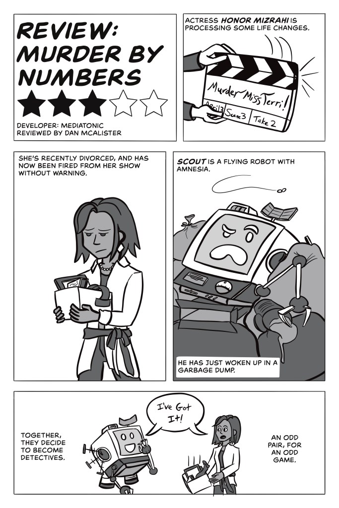 This is a black and white comic review of the video game Murder By Numbers.