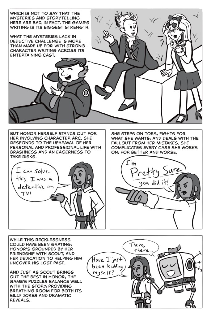 What the mysteries lack in deductive challenge is more than made up for with strong character writing across its entertaining cast.