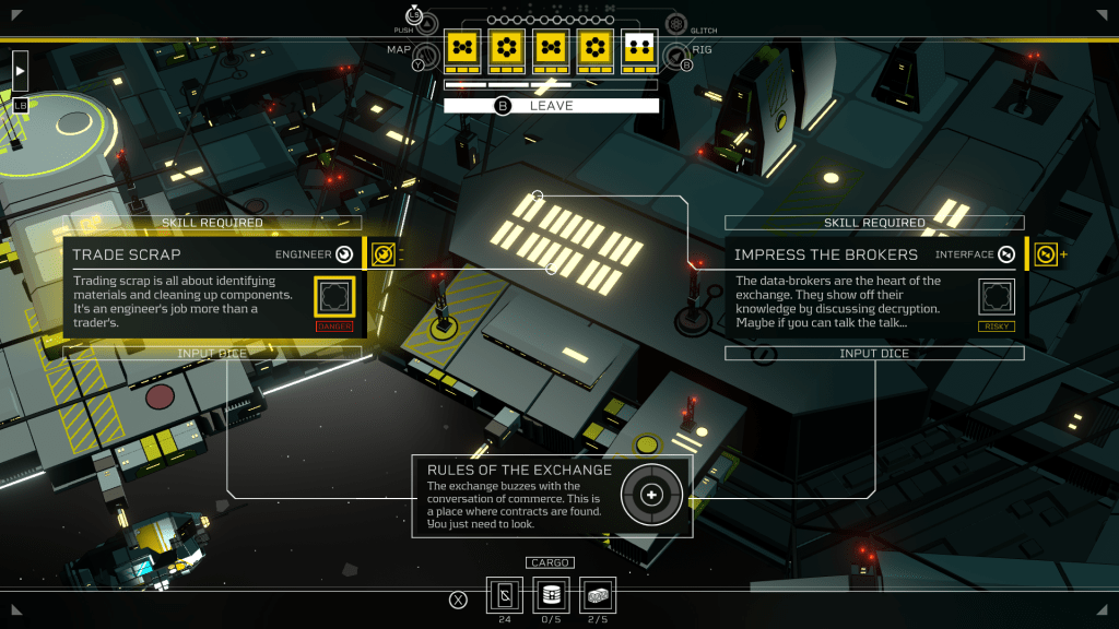 All tasks in Citizen Sleeper 2 are dice-based. You wake up every cycle (roughly equivalent to a day, but those don’t exist in space), roll five six-sided dice, check the results, and roughly know whether you’re in for a good cycle or a bad one. On a hub, you might be helping to harvest plants in microgravity, or hacking into a terminal to download a station map. On a contract, you’re more likely to be breaking through ancient security doors, or drilling into an ice-coated asteroid. Each of these tasks cost one die to engage in: put a six-die in for a guaranteed success, but a one-die will have a great chance of failure and negative consequence. Your Sleeper’s skills can tweak the odds: my Sleeper specialized in programming, so all programming tasks treated my dice as a number higher than it actually was, while endurance tasks diminished my die’s potency.